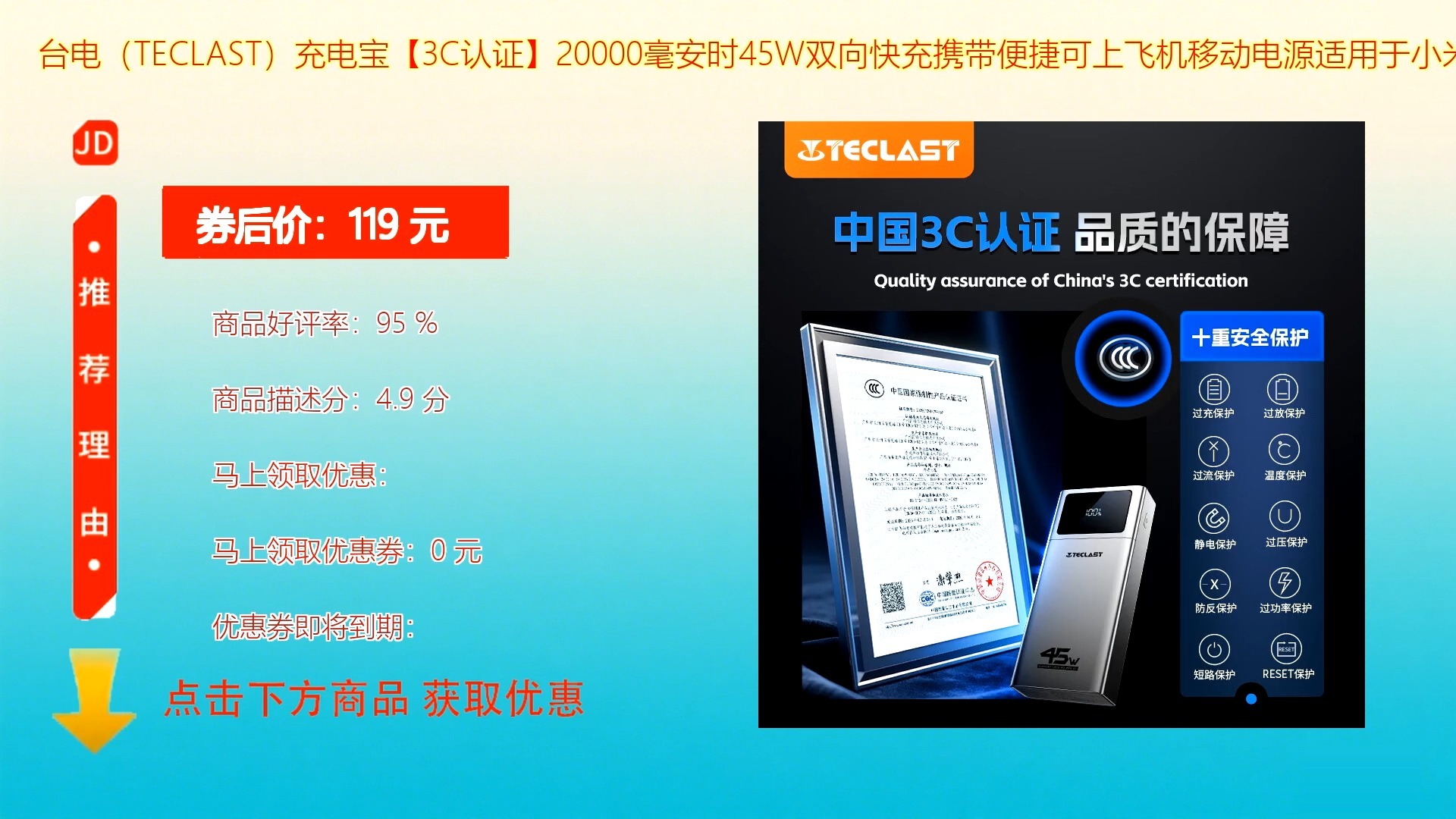 ![]() ![]() 台电_TECLAST_充电宝_3C认证_20000毫安时45W双向快充携带便捷可上飞机移动电源适用于 小宸日常 发布时间2025/09/19 12:21:20 | 1 | 0 | 0 | 0 |