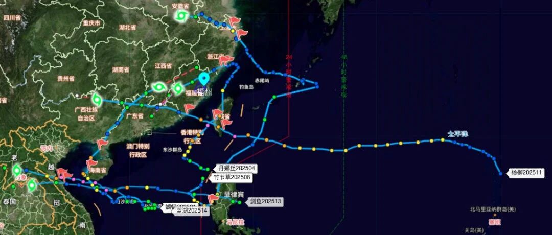 [星星]三是台风生成晚数量多,登陆早,风雨影响大。主汛期内有14个台风生成,较常年同期(11.1个)偏多,其中有5个台风登陆我国,接近常年同期(4.7个)。