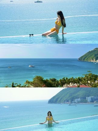 拍照巨出拍,不同角度有不同的风景,一面是海天一色,另一侧是绵延的群山山景~早上人少,适合趴在泳池边看海!
