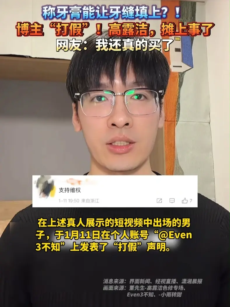 ![]() ![]() 称牙膏能让牙缝填上?! 博主“打假”!高露洁,摊上事了,网友:我还真的买了#高露洁 #牙膏 #虚假广告 #含氟牙膏 #牙齿健康 中国商报 发布时间2026/01/14 05:05:21 | 131 | 67 | 100 | 4797 | 更多 |