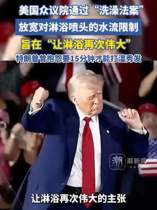 ![]() ![]() 美国众议院通过“洗澡法案”,放宽对淋浴喷头的水流限制,旨在“让淋浴再次伟大”,特朗普曾经抱怨要15分钟才能打湿秀发。 潮新闻 发布时间2026/01/15 07:57:16 | 1w | 1.2w | 1523 | 3w | 更多 |