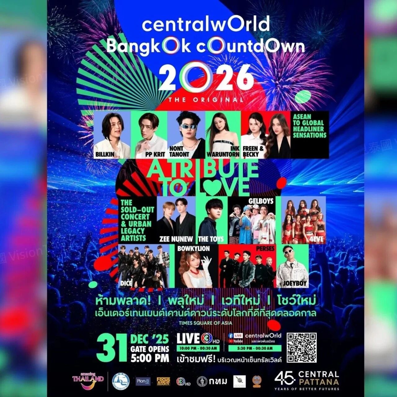 今年centralwOrld 的跨年晚会卡司阵容坚强,邀来以《以你的心诠释我的爱》走红的Billkin & PP Krit、《天生一对 2》主题曲演唱者 Ink Waruntorn、泰国流行男歌手Nont Tanont、创作女歌手 Bowkylion、当红音乐才子The Toys、饶舌歌手Joey Boy,以及人气女团4EVE、男团PERSES、DICE。