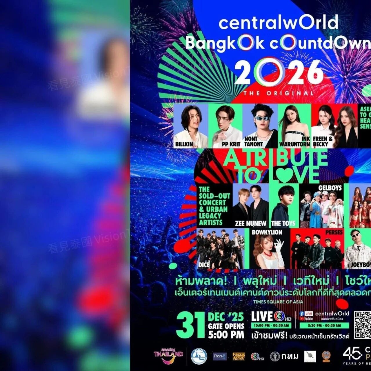 作为近年备受瞩目的大型复合开发案,壹曼谷One Bangkok以现代建筑与开放空间吸引目光。跨年舞台以年轻世代与都会风格为主轴,演出阵容横跨泰剧演员、当红男团与多世代音乐人。