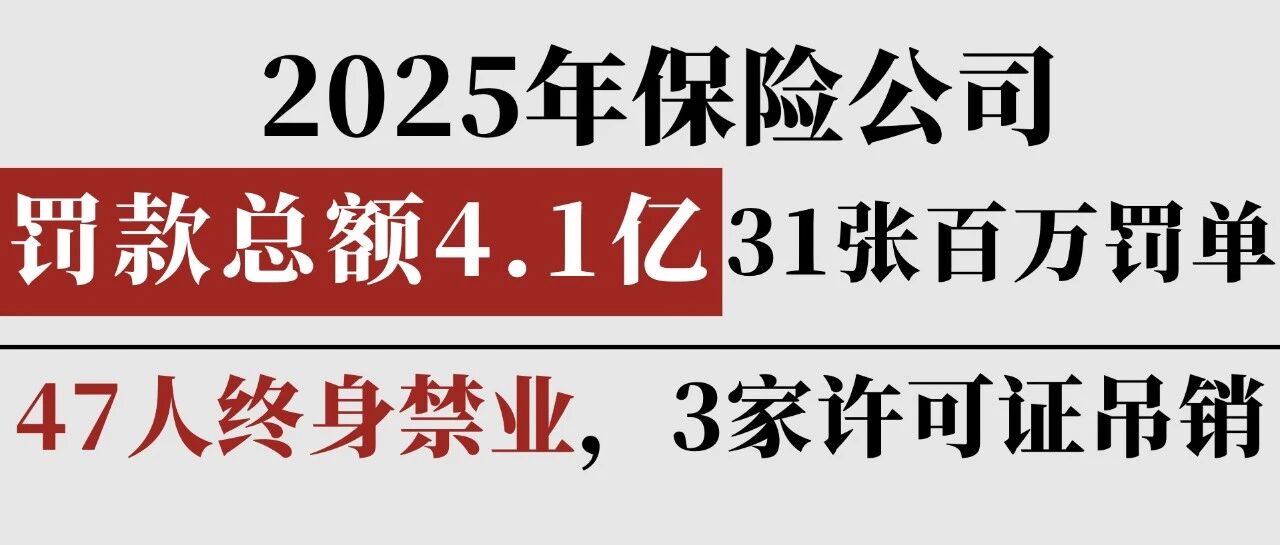 ![]() 2025年保险公司罚款超4.1亿:3家许可证被吊销,31张百万罚单,47人终身禁业,13人撤职,3家停新! 13个精算师 发布时间2026/01/08 14:24:47 | - | - | - | 64 | 更多 |