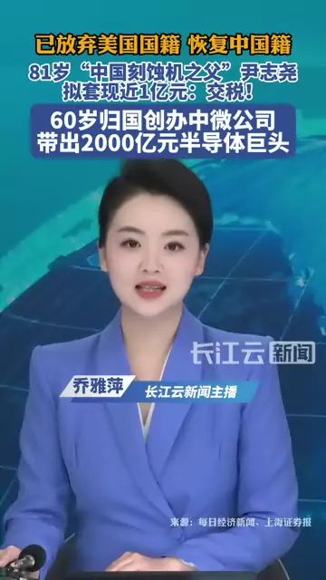![]() ![]() 已放弃美国国籍,恢复中国籍,81岁“中国刻蚀机之父”尹志尧拟套现近1亿元:交税!60岁归国创办中微公司,带出2000亿元半导体巨头 长江云新闻 发布时间2026/01/11 06:09:52 | 7489 | 2944 | 4463 | 10.5w | 更多 |