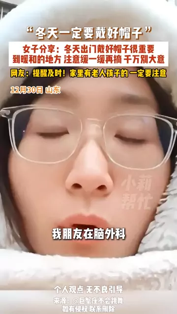 ![]() ![]() 12月30日,山东,“冬天一定要戴好帽子”,女子分享:冬天出门戴好帽子很重要,到暖和的地方,注意缓一缓再摘,千万别大意,网友:提醒及时!家里有老人孩子的,一定要注意。 #不一样的中国节气 #中国节气小寒篇 #二十四节气让生活更美好 #小莉帮忙上新啦 ![]() 河南民生频道小莉帮忙 发布时间2026/01/01 06:45:36 | 2800 | 6.2w | 2w | 8.6w | 更多 |