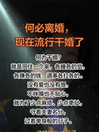 ![]() ![]() #为什么干婚的中年人越来越多了# 网上的“干婚”,指的是一种干巴巴的挂名夫妻,夫妻双方虽维持法律上的婚姻关系,但情感疏远、缺乏交流与亲密互动,生活上如同单身,只因孩子、户口、房产、社会形象等原因而将就维系,婚姻名存实亡。夫妻之间界限分明,像室友一样搭伙过日子。