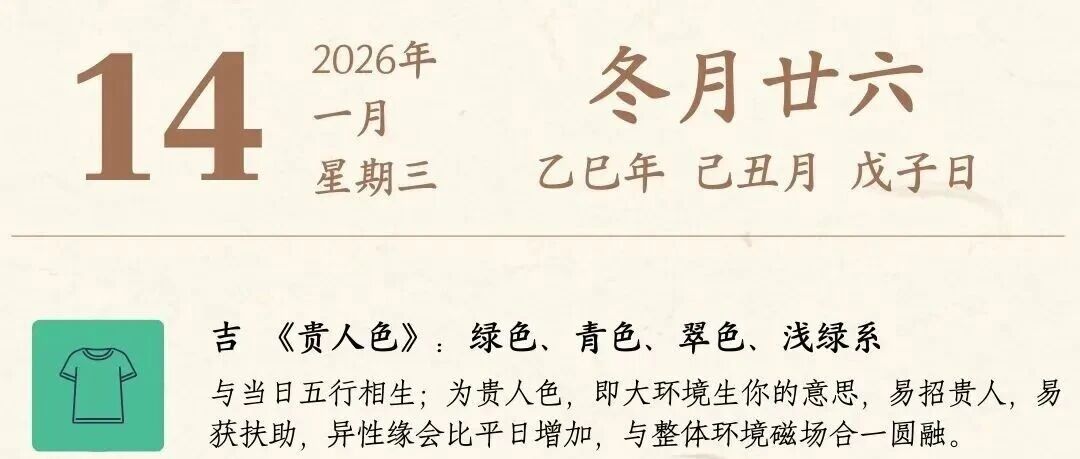 ![]() 【今日老黄历】2026年1月14日星期三【冬月廿六】十二生肖今日运势【生辰八字】今日麻将方位:正北方【今日特吉生肖:龙】 智慧生活先导 发布时间2026/01/13 23:46:09 | - | - | - | 52 | 更多 |