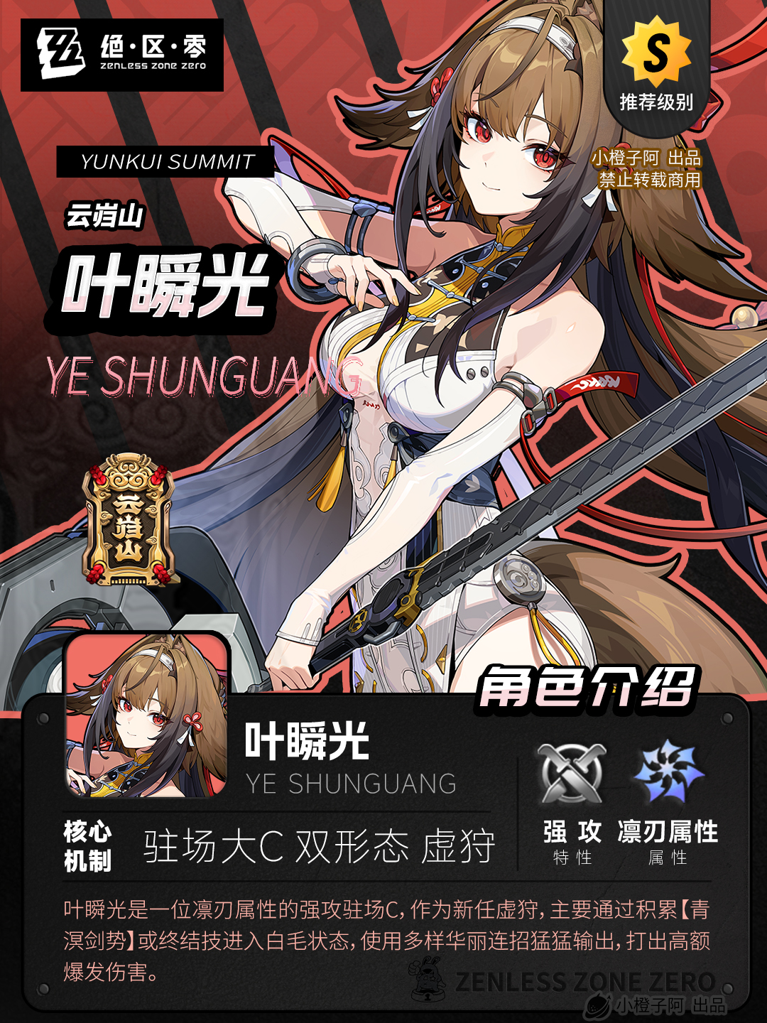 ![]() ![]() 第7集|哈喽喽,大家好!这里是小橙子阿!本期小橙子将带来绝区零新任虚狩—叶瞬光的角色攻略,全文将讲解小光的技能机制、音擎选择、驱动搭配、影画解析、队伍搭配以及角色总结。
