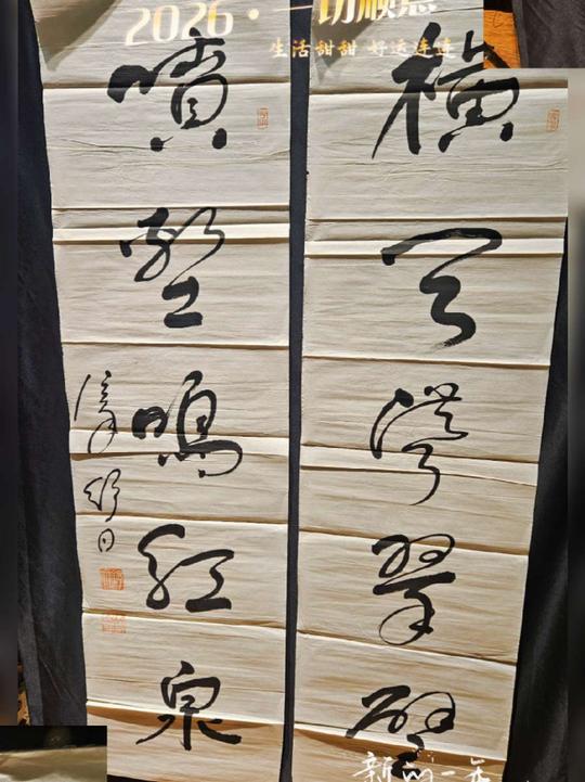 舒同先生于八三年创作“横天耸翠壁,喷壑鸣红泉”四尺对开五言联,句出李白《春陪商州裴使君游石娥溪》一诗:“裴公有仙标,拔俗数千丈。澹荡沧洲云,飘颻紫霞想。剖竹商洛间,政成心已闲。萧条出世表,冥寂闭玄关。我来属芳节,解榻时相悦。蹇帷对云峰,扬袂指松雪。暂出东城边,遂游西岩前。横天耸翠壁,喷壑鸣红泉。寻幽殊未歇,爱此春光发。溪傍饶名花,石上有好月。命驾归去来,露华生翠苔。淹留惜将晚,复听清猿哀。清猿断人肠,游子思故乡。明发首东路,此欢焉可忘。”天宝三年春(744)李白长安失意,离开朝廷后漫游各地,途经商州遇刺史裴延庆使君,两人同游城西十里驿站石娥溪写下此诗。明代杨慎曾评价此诗:“裴使君之仙标,李白之笔力,二者相得益彰,共绘出一幅春日山水图,令人叹为观止。”全诗以游踪为线,将对友人赞赏与景色喜爱巧妙融合,尽显李白自然洒脱之风。舒同先生择书联语描绘石娥溪壮丽景色,翠壁高耸、红泉喷涌,凸显大自然雄浑与生机。乙巳岁杪于豫地聚宝堂金先生处得观此联真迹,感而赋此,以记其胜。