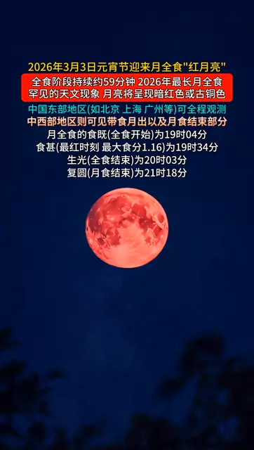 ![]() ![]() 2026年3月3日,元宵节恰逢月全食/血月奇观,双喜临门大家记得看哦#2026#元宵节#血月#天文奇观#红月 慧泽星空 发布时间2026/01/04 10:03:07 | 145 | 850 | 1636 | 2058 | 更多 |