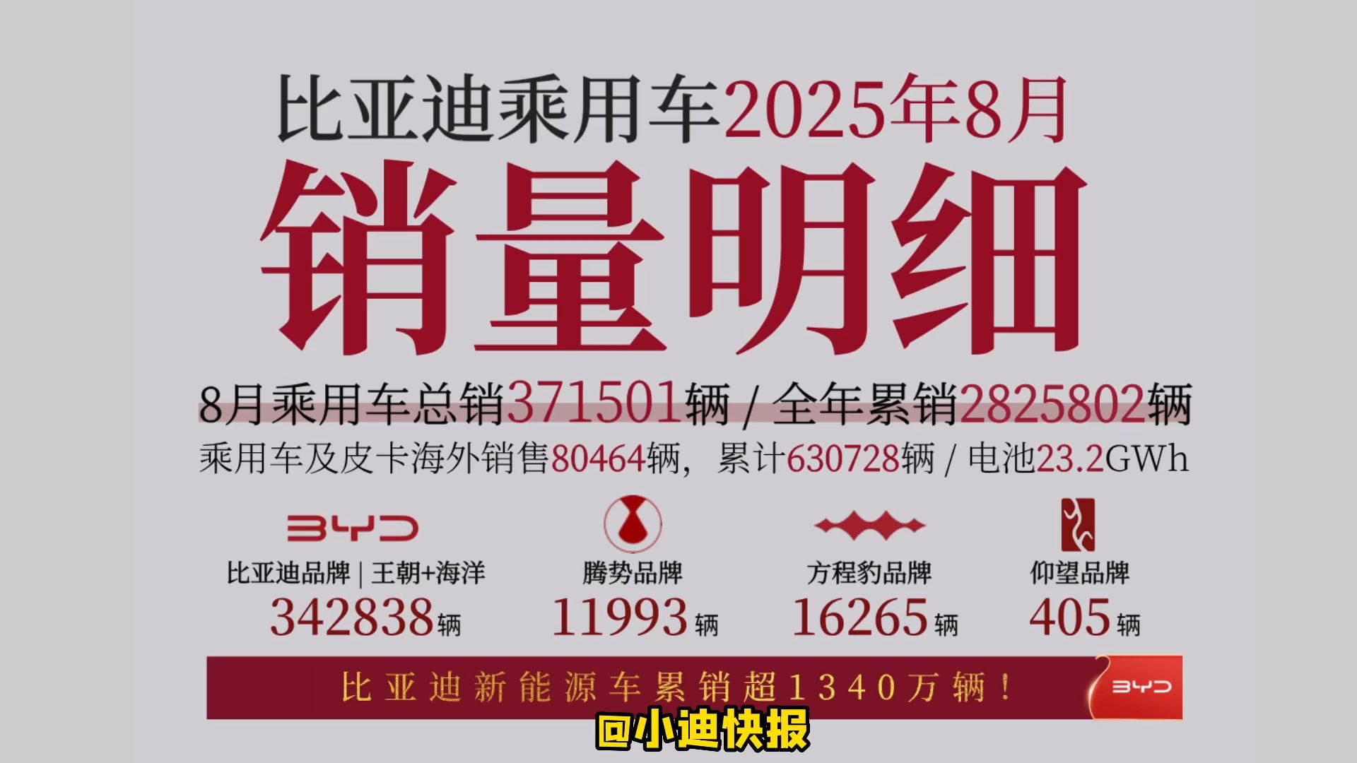 ![]() ![]() 37.2万辆!8月比亚迪销量明细!海外出口超8万辆!持续领先 2025年8月比亚迪乘用车销量明细:8月累计销售371501辆,乘用车及皮卡海外销售80464辆;比亚迪王朝150013辆 | 海洋189340辆;方程豹16265辆;腾势11993辆;仰望405辆。#比亚迪销量 #比亚迪出口 #8月比亚迪销量 #比亚迪8月销量 #汽车销量排行 ![]() 小迪快报 发布时间2025/09/01 13:19:09 | 218 | 19 | 20 | 434 |