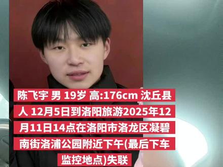 ![]() ![]() #上热门 陈飞宇 男 19岁 高:176cm 沈丘县人 12月5日到洛阳旅游2025年12月11日14点在洛阳市洛龙区凝碧南街洛浦公园附近下午(最后下车监控地点)失联#dou来寻人 #好事成真#让爱回家#让爱回家流浪救助 让爱回家官方账号 发布时间2026/01/04 15:03:59 | 2.2w | 3.6w | 1.1w | 27w | 更多 |