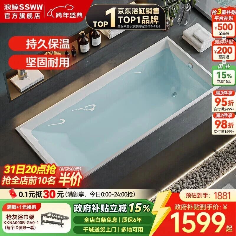 ![]() 浪鲸(SSWW) 卫浴浴缸 亚克力嵌入式浴缸 定制浴缸长方形薄边小户型家用浴缸 【1.3m】丨定制约15天发货 好物情报 发布时间2026/01/02 00:15:49 | - | - | - | 2 | 更多 |