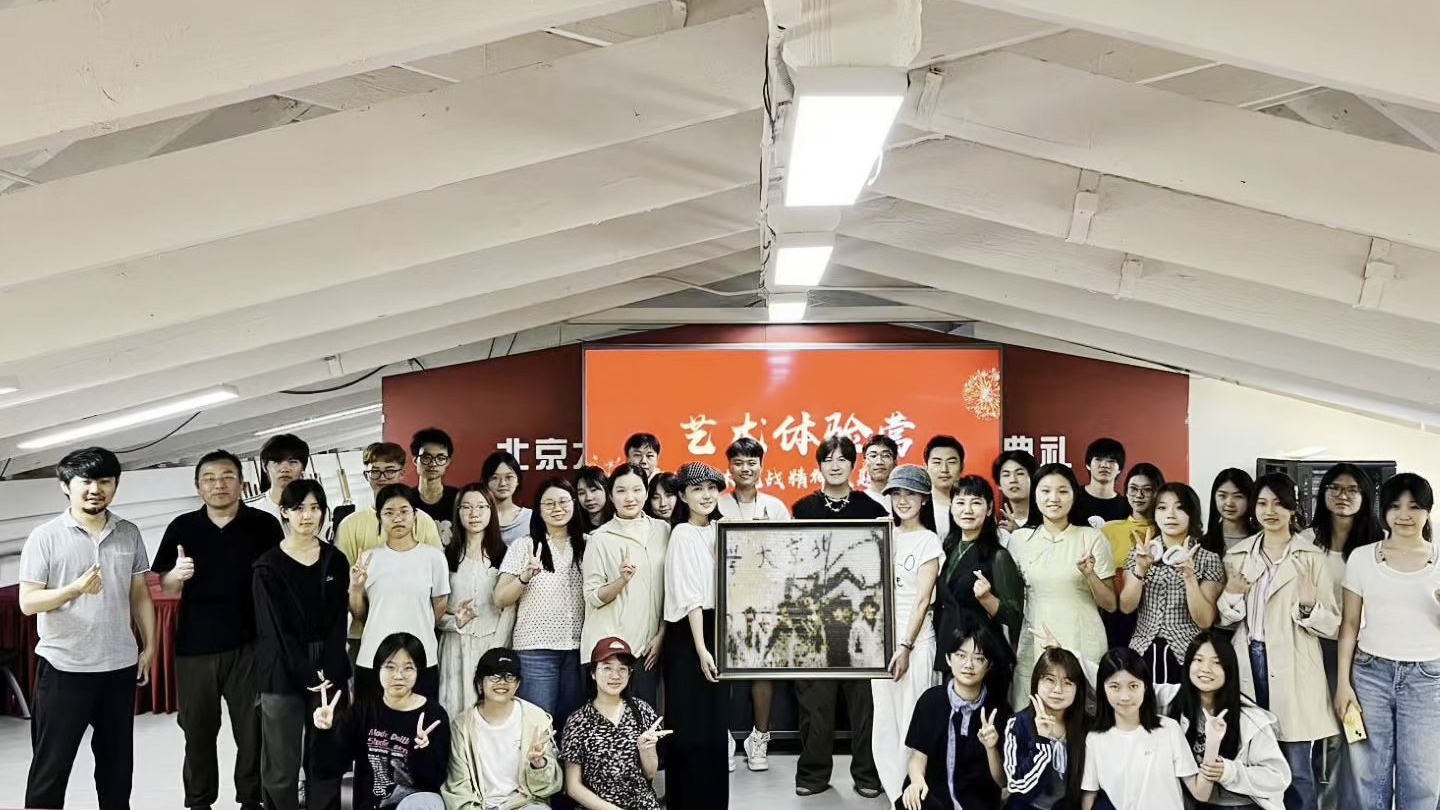 ![]() 2025 年 9 月 4 日,北京大学艺术学院均斋报告厅里,2025 级新生代表“用颗粒传达心声”,36 名新同学和艺术学院颗粒艺术实验室的师生以8400块颗粒方共同创作了 60cm×70cm 的平面颗粒艺术作品《爱我中华》,画面是1935年“一二·九”运动中,北大学生游行队伍高呼“打倒日本帝国主义”等口号在前进。本次工作坊是艺术学院新生入学教育抗战精神主题特色活动暨艺术学院2025-2026学年湖畔艺术季系列“弘扬抗战精神 传承红色基因”主题活动之一。
