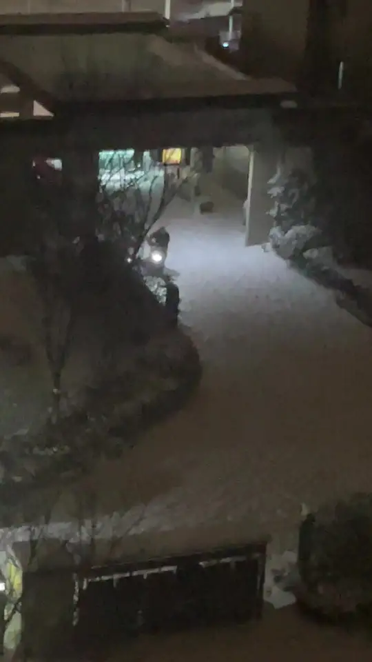 雪还在下,纷纷扬扬的,地上早已积了厚厚一层。一个黄色的身影在路灯下特别显眼——他没骑车,而是双手扶着车把,一步一步推着电动车往前走。车轮在雪里压出两道深深的痕,他走得很慢,很稳,身子微微前倾,怕的应该不只是路滑。