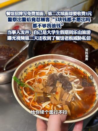![]() ![]() 餐馆招牌写免费加面,第二次续面却要收费3元 当事人发声:自己是大学生假期到乐山旅游,曝光视频第二天还收到了餐馆老板威胁私信#热点新闻事件 #热点追踪 #续面 海报新闻 发布时间2026/01/27 06:06:36 | 47 | 6084 | 1919 | 6.4w | 更多 |