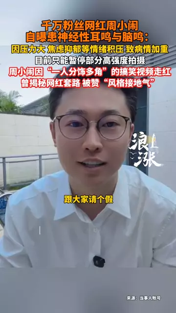 ![]() ![]() 千万粉丝网红周小闹自曝患神经性耳鸣与脑鸣:因压力大 焦虑抑郁等情绪积压 致病情加重,目前只能暂停部分高强度拍摄。