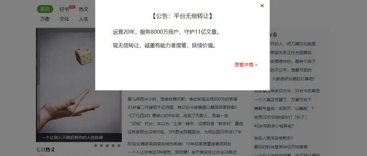 ![]() 运营20年,知名平台突然宣布难以为继!8000万注册用户怎么办?创始人长文恳求↗ 新闻坊 发布时间2026/01/27 01:46:56 | 25 | - | - | 197 | 更多 |