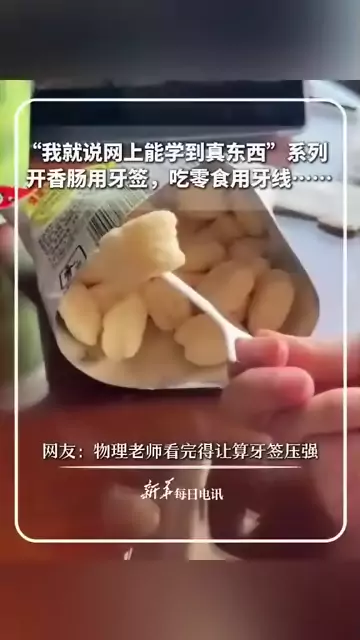 ![]() ![]() “我就说网上能学到真东西”系列,开香肠用牙签,吃零食用牙线……网友:物理老师看完得让算牙签压强。 ![]() 新华社 发布时间2026/01/02 14:22:30 | 858 | 6815 | 1.9w | 73.3w | 更多 |