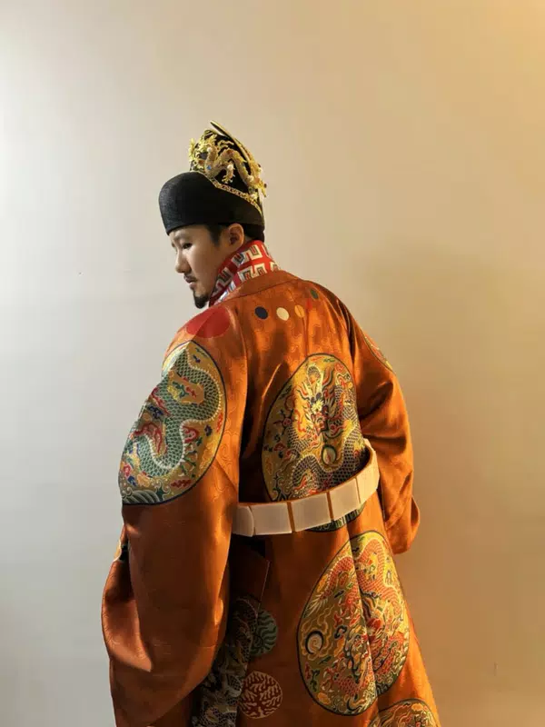 头戴二龙戏珠乌纱翼善冠,身穿黄栌色十二章衮服,虚束革带,构成了晚明宫廷审美之绝唱。