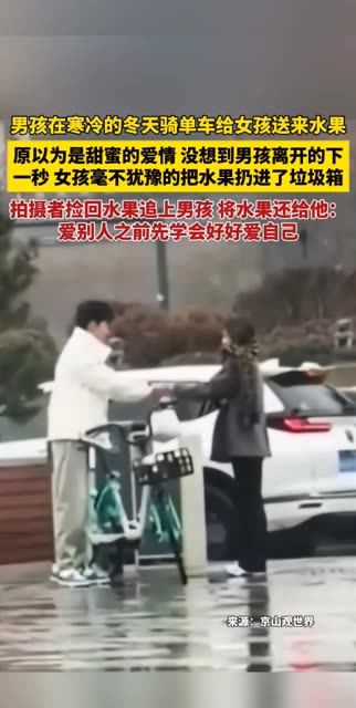 ![]() ![]() #在意你的话 男孩在寒冷的冬天骑单车给女孩送来水果,原以为是甜蜜的爱情 没想到男孩离开的下一秒 女孩毫不犹豫的把水果扔进了垃圾箱!拍摄者捡回水果追上男孩 将水果还给他:爱别人之前先学会好好爱自己! ![]() 热点周报 发布时间2025/12/23 01:18:27 | 2117 | 1973 | 1454 | 2.6w | 更多 |
