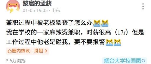 ![]() 【烟大热事】学生兼职过程中遇骚扰该怎么办 | 为觅姐麻辣烫店主点赞! In烟海校园 发布时间2026/01/08 12:50:32 | - | - | - | 70 | 更多 |