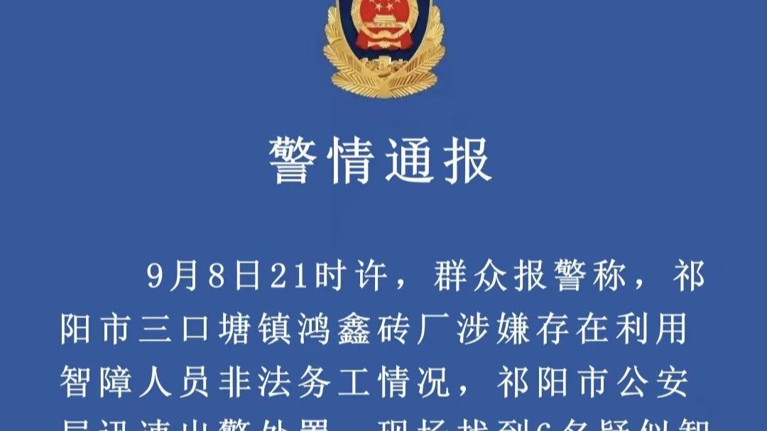 ![]() ![]() 【#警方在砖厂找到6名疑似智障人员#】据祁阳市公安局2025年9月9日发布警情通报:9月8日21时许,群众报警称,祁阳市三口塘镇鸿鑫砖厂涉嫌存在利用智障人员非法务工情况,祁阳市公安局迅速出警处置,现场找到6名疑似智障人员,依法对工厂相关人员进行了控制。目前案件正在进一步侦办中。 ![]() 百姓关注 发布时间2025/09/09 04:47:02 | 91 | 42 | - | 546 |