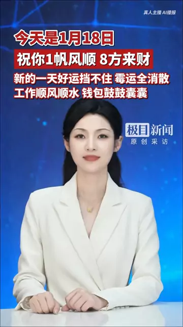 ![]() ![]() 今天是1月18日,祝你1帆风顺、8方来财!新的一天好运挡不住,霉运全消散,工作顺风顺水,钱包鼓鼓囊囊 ![]() 极目新闻 发布时间2026/01/17 22:00:00 | 6446 | 2099 | 1556 | 3.9w | 更多 |