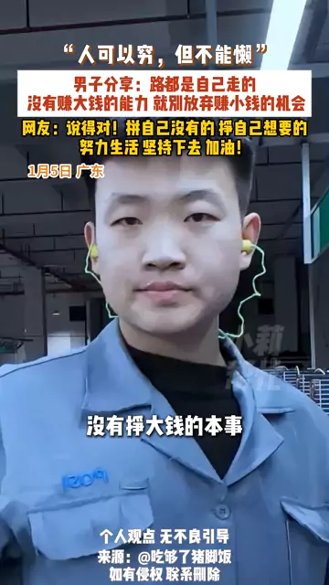 ![]() ![]() 1月5日,广东,“人可以穷,但不能懒”,男子分享:路都是自己走的,没有赚大钱的能力,就别放弃赚小钱的机会,网友:说得对!拼自己没有的,挣自己想要的,努力生活,坚持下去,加油! ![]() 河南民生频道小莉帮忙 发布时间2026/01/06 08:49:24 | 1269 | 4564 | 1w | 5w | 更多 |