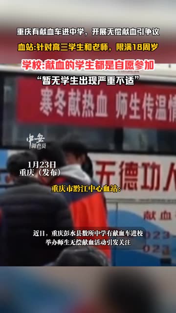 ![]() ![]() 1月23日重庆(发布),重庆有献血车进中学,开展无偿献血引争议,血站:针对高三学生和老师,限满18周岁,学校:献血的学生都是自愿参加,“暂无学生出现严重不适”。(编辑:小yu)投稿邮箱:3882124142@qq.com;更多视频点击关注@中安在线 ![]() 中安在线 发布时间2026/01/23 05:00:11 | 6971 | 286 | 349 | 1.1w | 更多 |