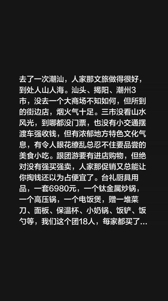 去了一次潮汕,人家那文旅做得很好,到处人山人海。汕头、揭阳、潮州3市,没去一个大商场不知如何,但所到的街边店,烟火气十足。三市没看山水风光,到哪都没门票,也没有小交通摆渡车强收钱,但有浓郁地方特色文化气息,有令人眼花缭乱总忍不住要品尝的美食小吃。跟团游要有进店购物,但绝对没有强买强卖,人家那促销又总能让你掏钱还以为占便宜了。台礼厨具用品,一套6980元,一个钛金属炒锅,一个高压锅,一个电饭煲,赠一堆菜刀、面板、保温杯、小奶锅、饭铲、饭勺等,我们这个团18人,每家都买了一套。这样算下来,我和家属2人,5晚6天,食宿好,玩得开心,拍了十几段小视频记录旅程,总花销1万元出头。玩完了,老伴还说,以后回北京如自驾路过,得多住几天,玩玩透。[赞] 赤江河 发布时间2026/01/14 06:31:52 | 131 | 7 | 9 | 345 | 更多 |