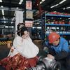 当制雪机器启动的时候,我发现“雪”好大,好有氛围。她的头发和睫毛上都沾满了“雪花”,和真的一样。