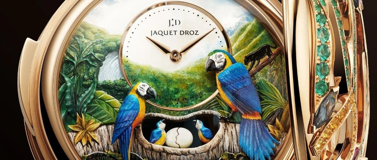Jaquet Droz 推出定制独一款「Tourbillon Dragon John Howe」腕表,与《指环王》艺术总监 John Howe 合作设计。43mm 白金表壳经镜面抛光,黑色表盘呈「8」字形布局,6 点偏心时分盘,12 点设陀飞轮视窗,配蓝钢秒针。表盘下半部,John Howe 绘制的邪恶蓝色巨龙盘踞,先以大明火珐琅烧制午夜蓝身躯,再手工微绘细节,立体生动,前爪握发光“宝珠”。搭载 Caliber 25JD 自动上链机芯,7 天动力储备,玫瑰金摆陀镶黑缟玛瑙切片,表背镌刻独有铭文。