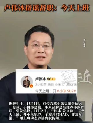 ![]() ![]() 卢伟冰辟谣辞职:今天上班 据鞭牛士,1月11日,有传言称小米集团合伙人、总裁,手机部总裁,小米品牌总经理卢伟冰辞职,引发热议。1月12日,卢伟冰 发文称,"今天上班,开小米SU7,全程开启HAD,非常丝滑。"用上班动态辟谣离职传闻。#小米 #卢伟冰 远近新闻 发布时间2026/01/12 04:04:11 | 44 | 5 | 14 | 153 | 更多 |