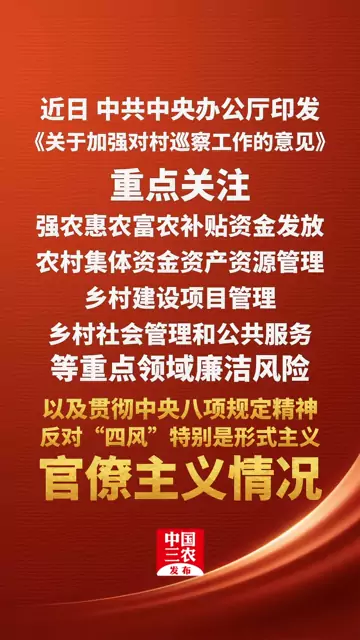 ![]() ![]() 中共中央办公厅印发《关于加强对村巡察工作的意见》,重点关注强农惠农富农补贴资金发放、农村集体资金资产资源管理、乡村建设项目管理、乡村社会管理和公共服务等重点领域廉洁风险 ![]() 中国三农发布 发布时间2026/01/23 00:25:46 | 48 | 118 | 182 | 1.4w | 更多 |