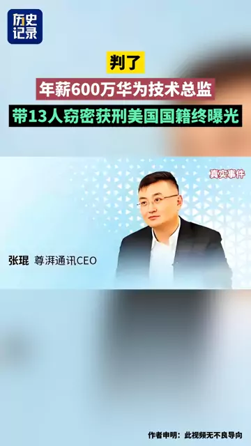 曾经在华为公司担任技术总监的张琨,被判处六年有期徒刑,罚款300万元人民币。