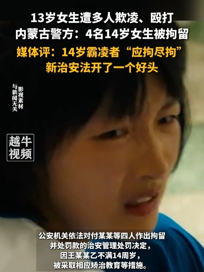 ![]() ![]() 13岁女生在校外被殴打,内蒙古五原县警方通报:涉案人员均已到案,4名14岁女生被拘留并罚款,1名女生不满14周岁被矫治教育 澎湃新闻 发布时间2026/01/13 11:38:50 | 40 | 702 | 115 | 1032 | 更多 |