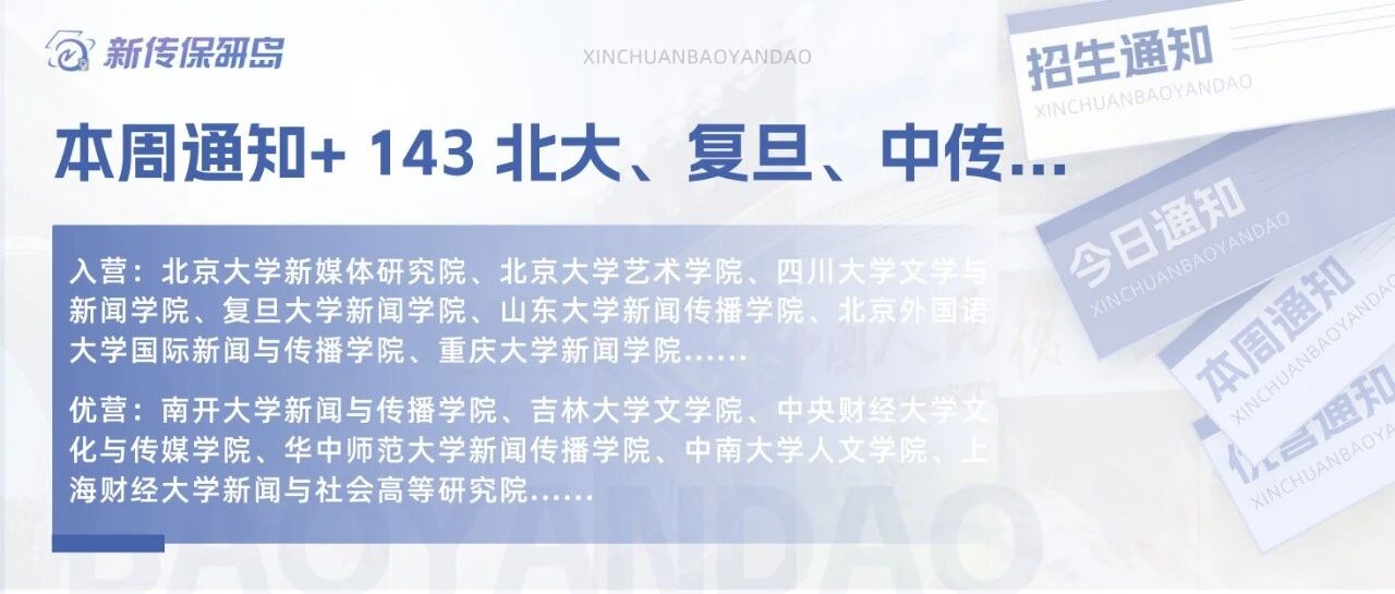 ![]() 本周通知+143,上交文创九推通知发布!南开新传、央财文传、中南人文、中农人发、华师新传、湘潭文新等院校优营名单出炉! 新传保研岛 发布时间2025/09/21 10:59:05 | - | - | - | 20 |