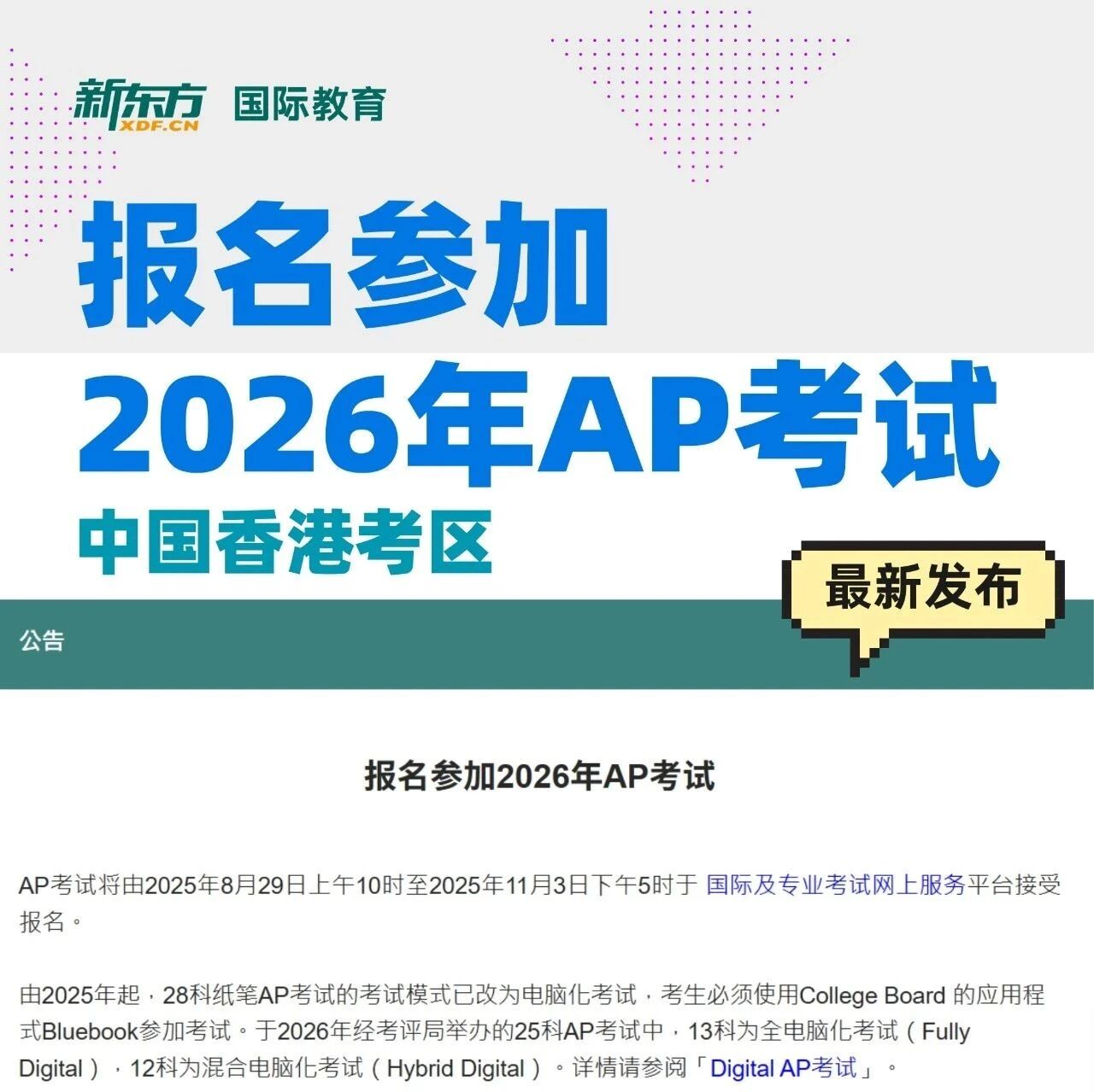 ![]() 2026AP考试中国香港考区即将开放报名了! | - | - | - | 5 |