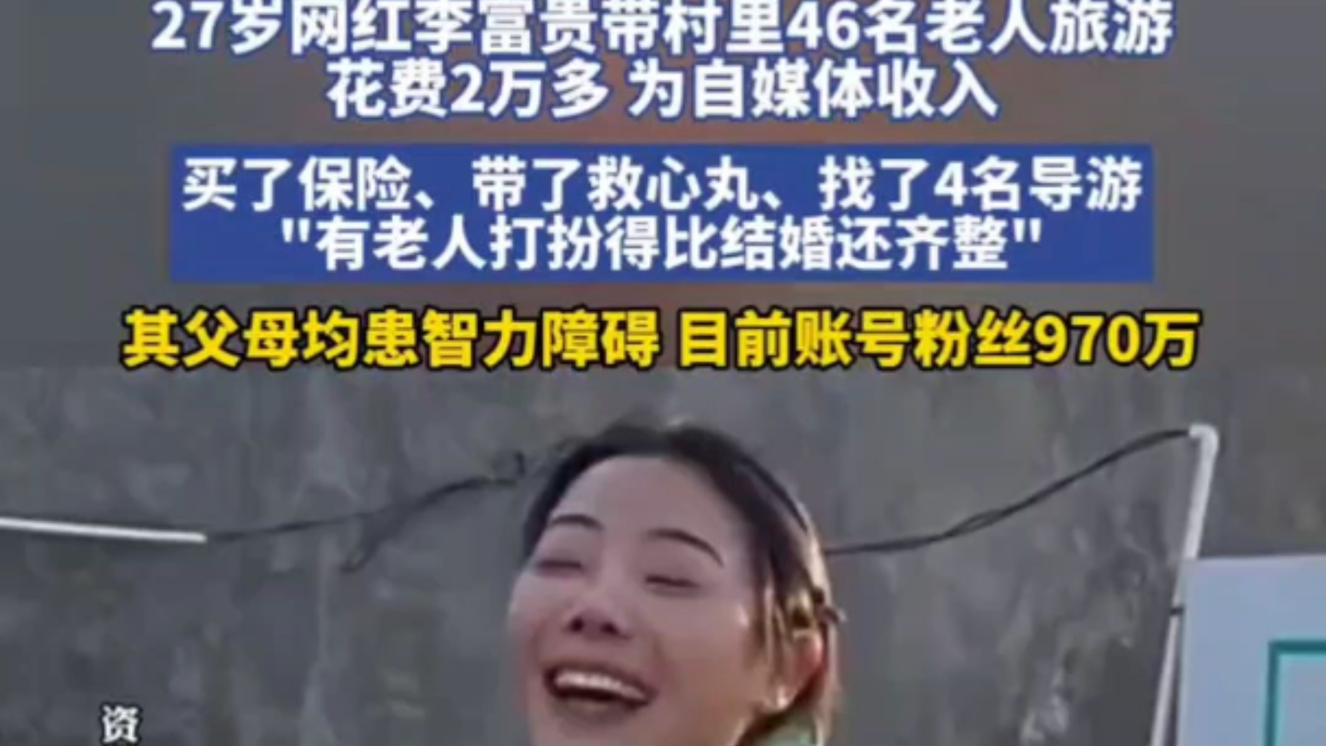![]() ![]() 27岁网红李富贵带村里46名老人旅游,花费2万多 为自媒体收入 秒览天下 发布时间2025/08/22 23:49:47 | 132 | 3 | 66 | 1.1w |