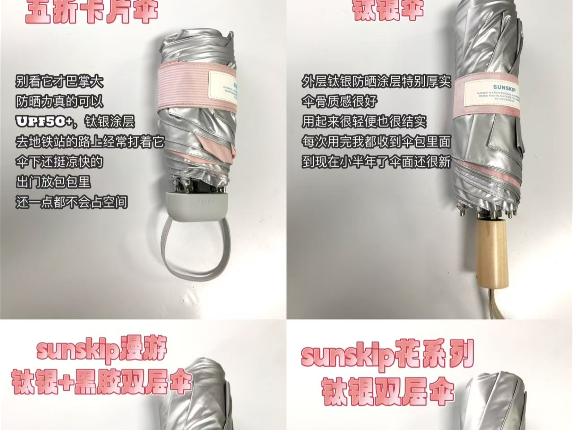 🌂sunskip漫游:一层钛银一层黑胶,双层防晒力度top,UPF50+能阻隔99.9999%的紫外线,防晒力非常能打,也能晴雨两用平时做了医美项目之后怕反黑我就用这把