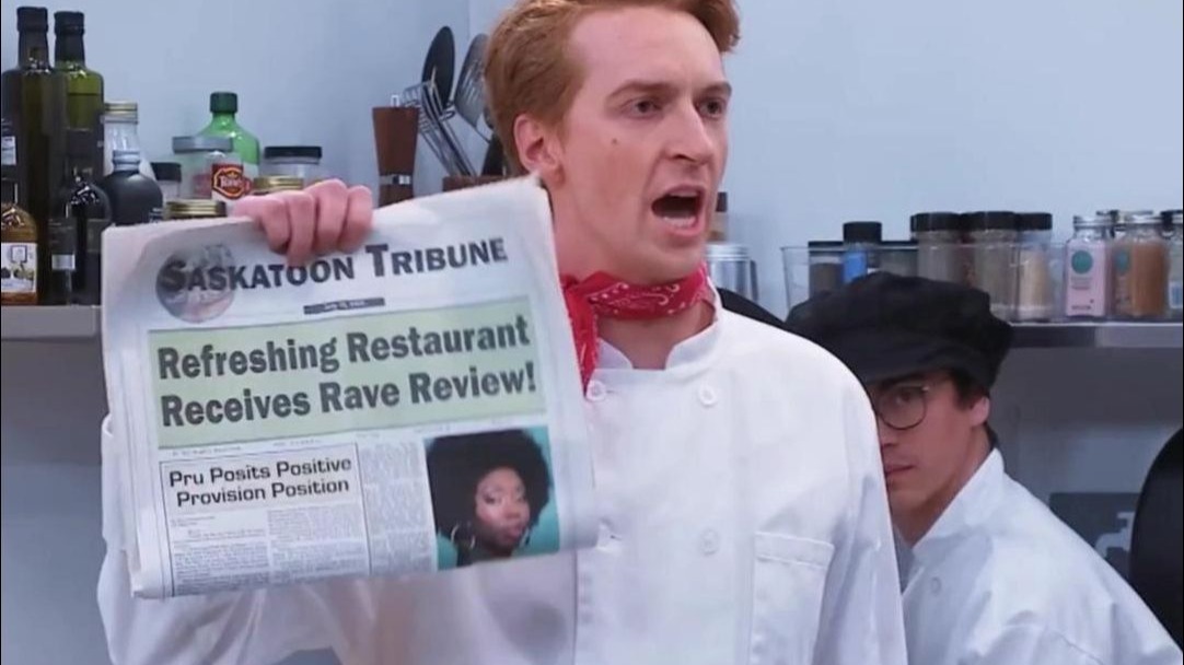 A kitchen descends into a tongue-tied frenzy as the head chef (Garet) juggles orders and staff roles.