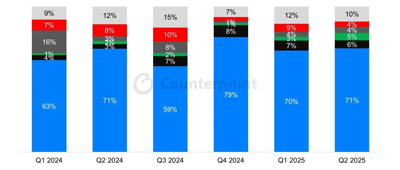 VR市场面临双重压力,该季度出货量同比降2%,环比降幅更扩大到15%。分析师指出,这一方面源于消费电子需求疲软,消费者对非刚需设备采购意愿下降;另一方面是行业 “硬件先行、内容滞后”,优质独占内容稀缺制约了需求。不过,Meta旗下 Quest 3S凭借轻量化设计、沉浸式体验及亲民定价,蝉联全球最畅销VR头显,贡献其近60%的VR出货量,进一步拉开与竞品差距。