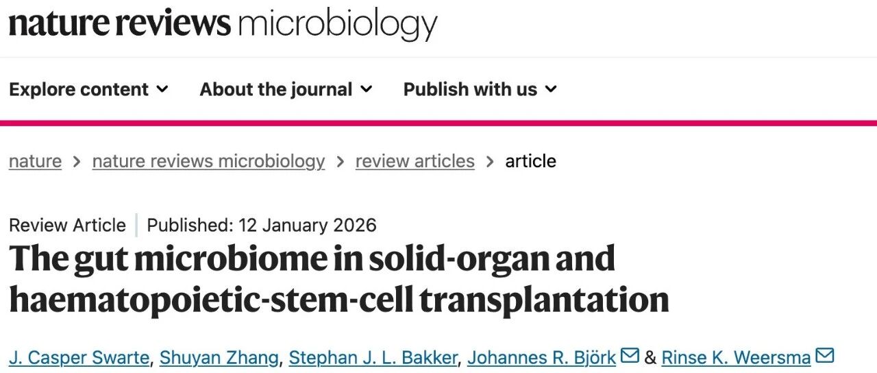 ![]() Nature Reviews Microbiology|实体器官移植与造血干细胞移植中的肠道微生物组 小包子学演化 发布时间2026/01/13 16:01:01 | 1 | - | - | 2 | 更多 |