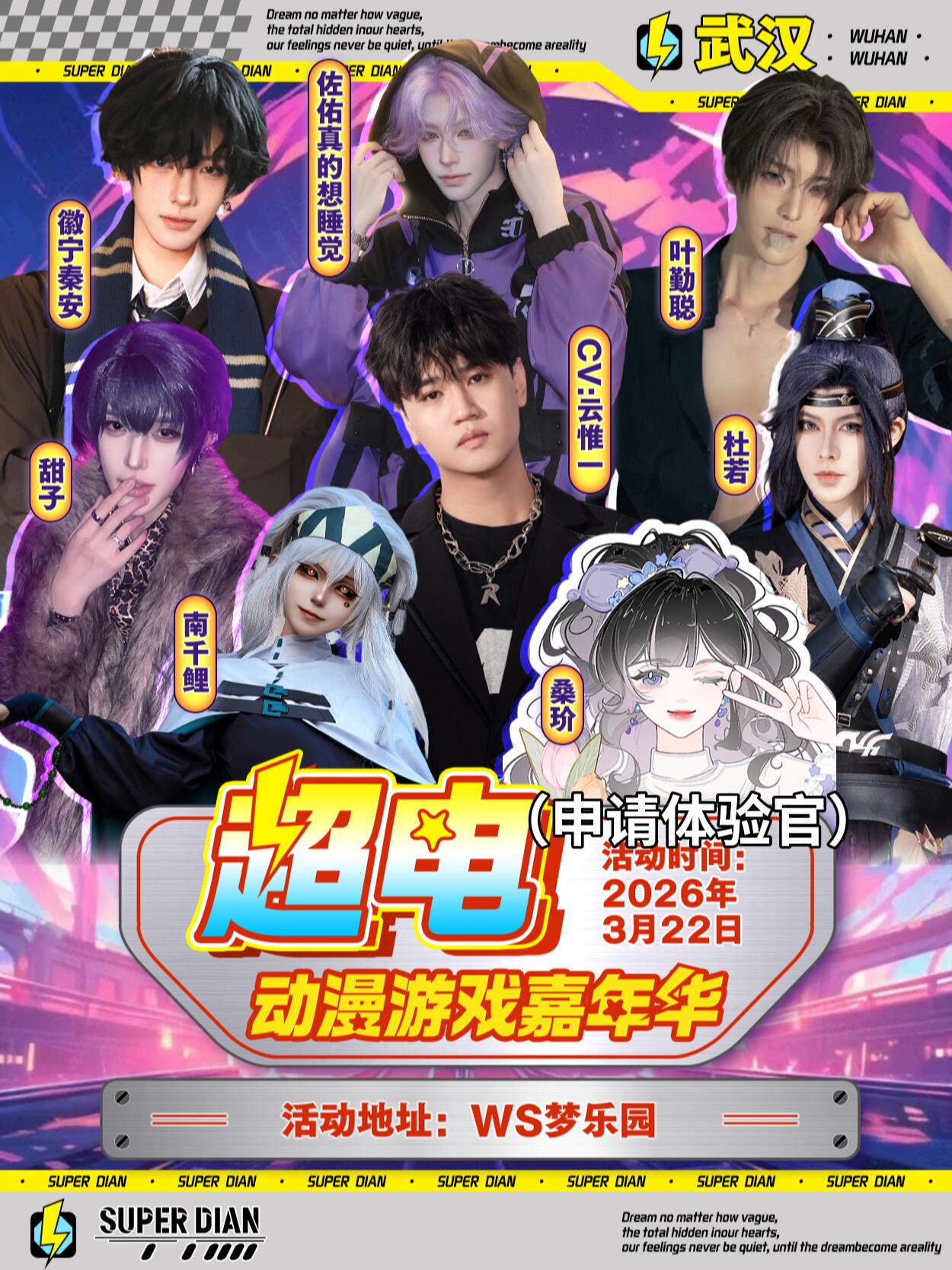 我将在2026年03月22日在WS梦乐园(武商梦时代店)参与超电游玩一天!本次超电参展嘉宾多多:云惟一、甜子、叶勤聪、徽宁秦安、佐佑真的想睡觉、南千鲤、桑玠、杜若嘉宾阵容!