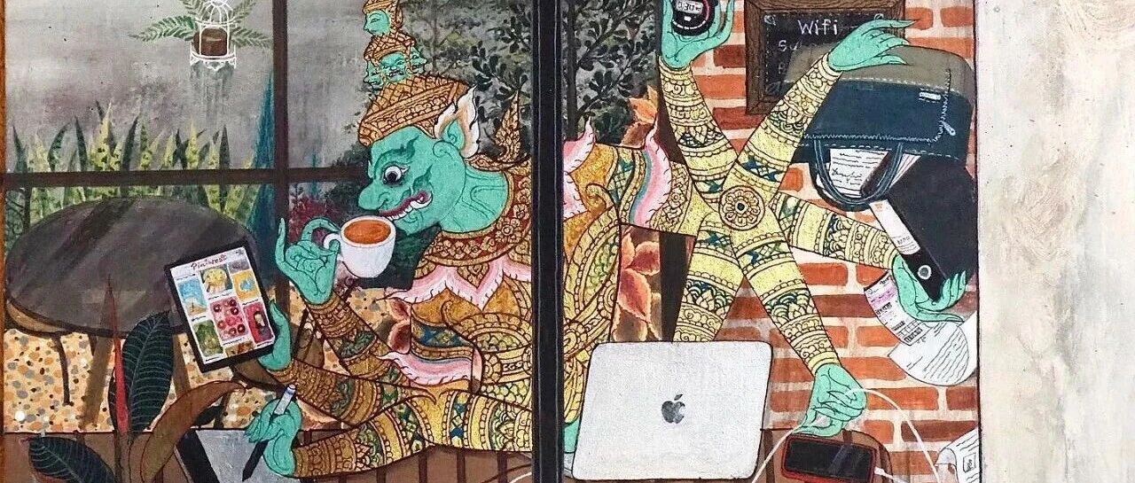 例如,魔王Thotsakan变身自由工作者,尽管拥有多只手却仍然无法按时完成工作;而拉克什玛那(Lakṣmaṇa)在做vlog。这些「神圣角色」与日常行为的冲突,暗示了现代人如何在消费文化与社交表演中重新定义“神话”。